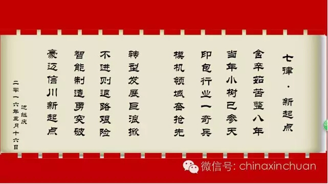 邊繼慶董事以一首《七律▪新起點》揭開了信川機械八周年的序幕。八年的風風雨雨,八年的篳路藍縷,至2016年5月16日,山東信川機械有限責任公司已成立八周年。在此佳日,捷報頻傳,落戶煙臺的信川機械智能聯(lián)動線平穩(wěn)過渡試運行階段,正式投入生產(chǎn)使用!這意味著八年后的今天,信川機械轉(zhuǎn)型升級為制造業(yè)服務(wù)企業(yè),也昭示著信川機械在印后智能聯(lián)動線領(lǐng)域的領(lǐng)導者地位!