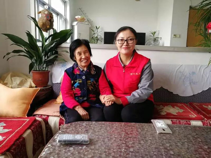 義工趕赴員工家中送去祝福,并與老人合影留念
